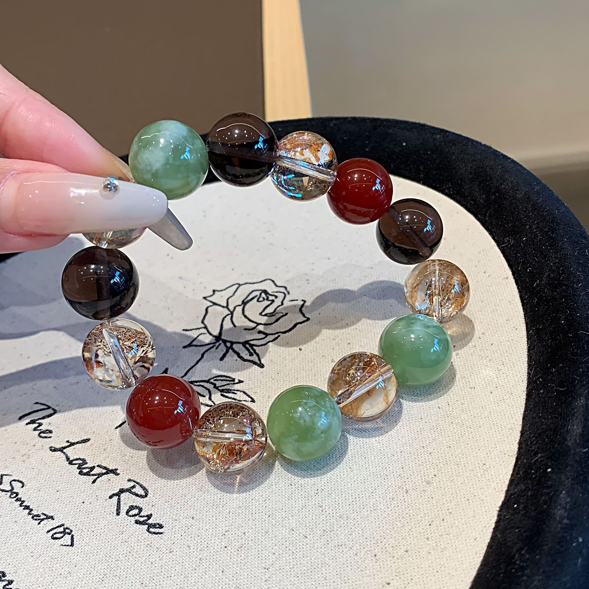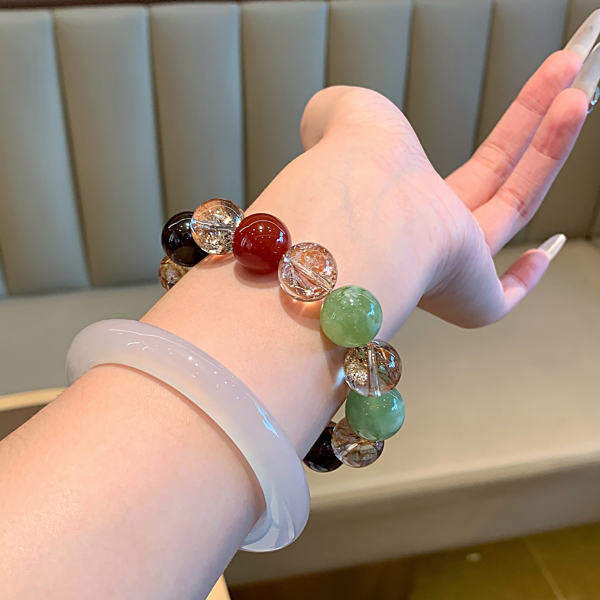 This bracelet features a warm mix of natural gold-foil crackle quartz, deep brown smoky quartz, rich red tones, and soft green jade-like beads.
